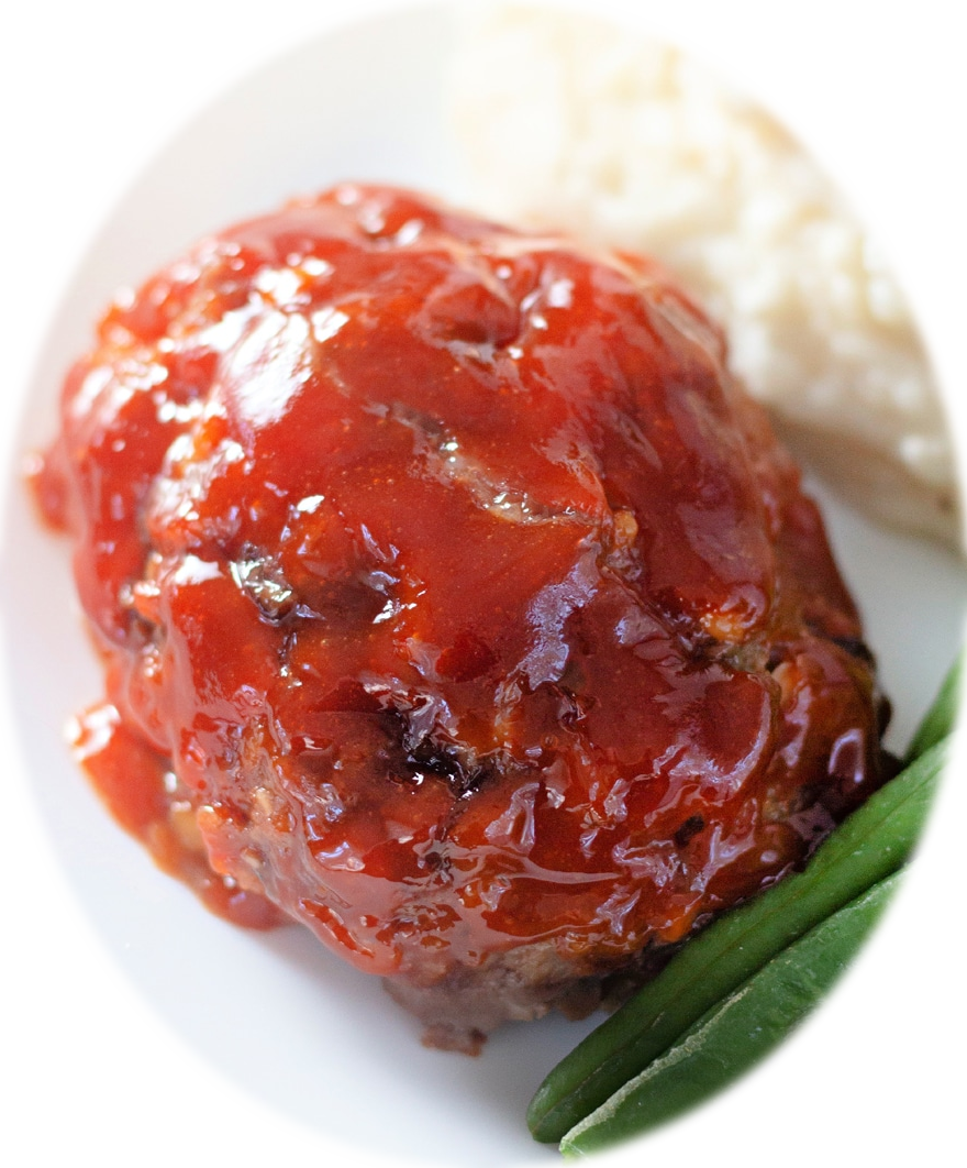 Besides being–usually–boring, another problem with meatloaf is that slab of ground beef on your plate. Even if it smells and tastes cool, it doesn’t look cool. It looks even less appetizing when it’s left-overs. Mini-meatloaf solves both the slab of ground beef and left-over problems. With this recipe, you get an individually-sized meatloaf, shaped like a large meatball, and glazed with a savory sweet sauce.